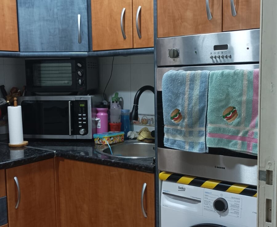 La cocina está completamente equipada y cuenta con galería, aportando un espacio adicional muy práctico para almacenamiento y zona de lavado.
